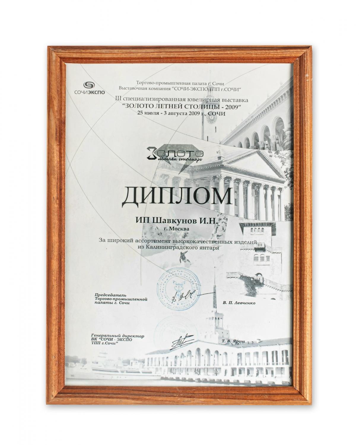 Диплом за широкий ассортимент высококачественных изделий из Калининградского янтаря
